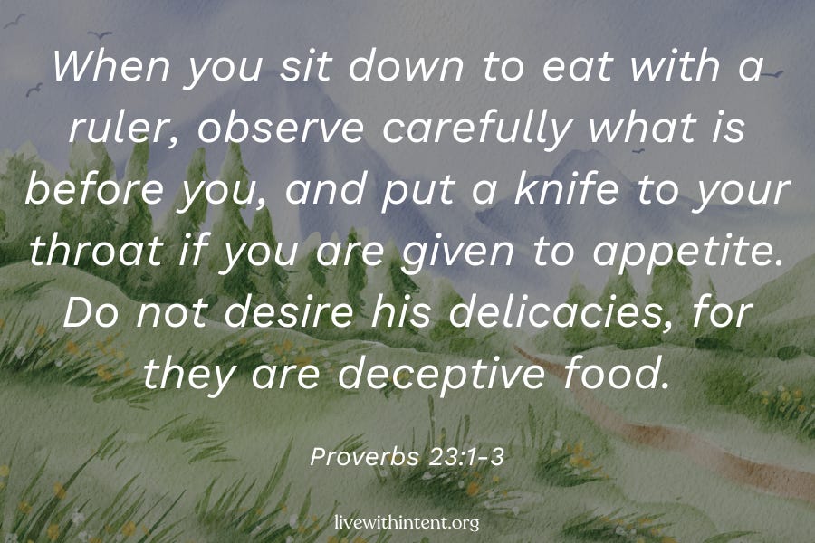 Proverbs 23:1–3 says, “When you sit down to eat with a ruler, observe carefully what is before you, and put a knife to your throat if you are given to appetite. Do not desire his delicacies, for they are deceptive food.”